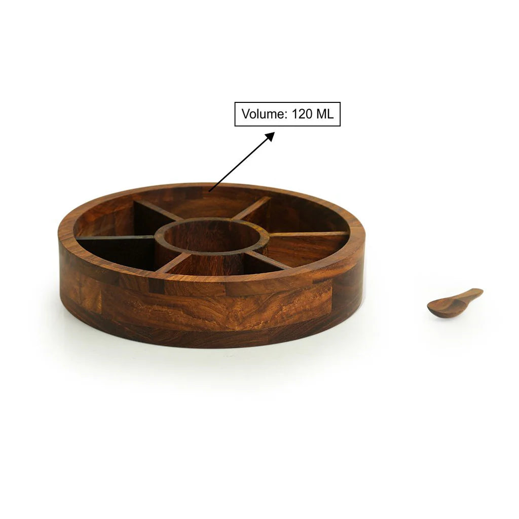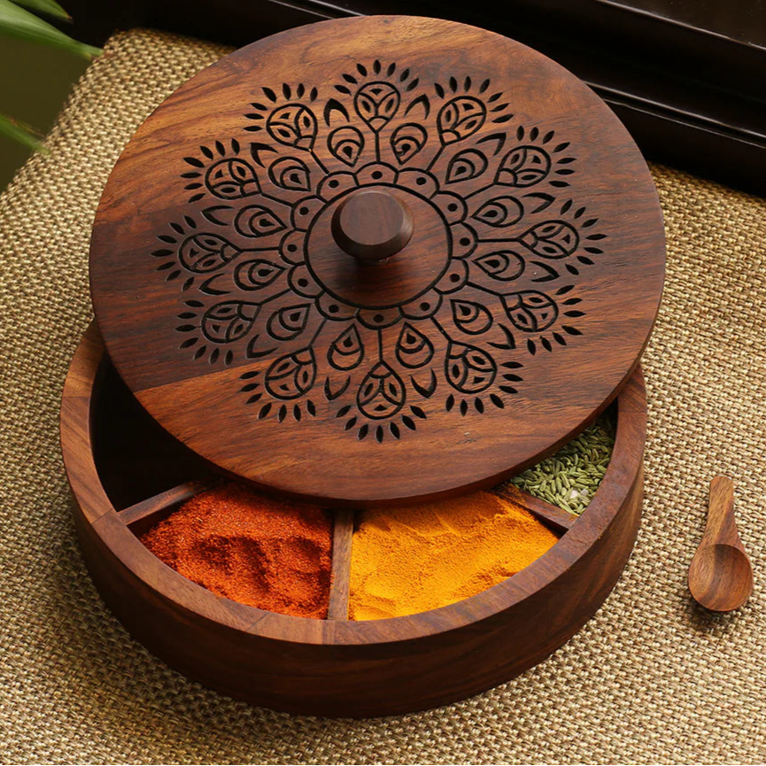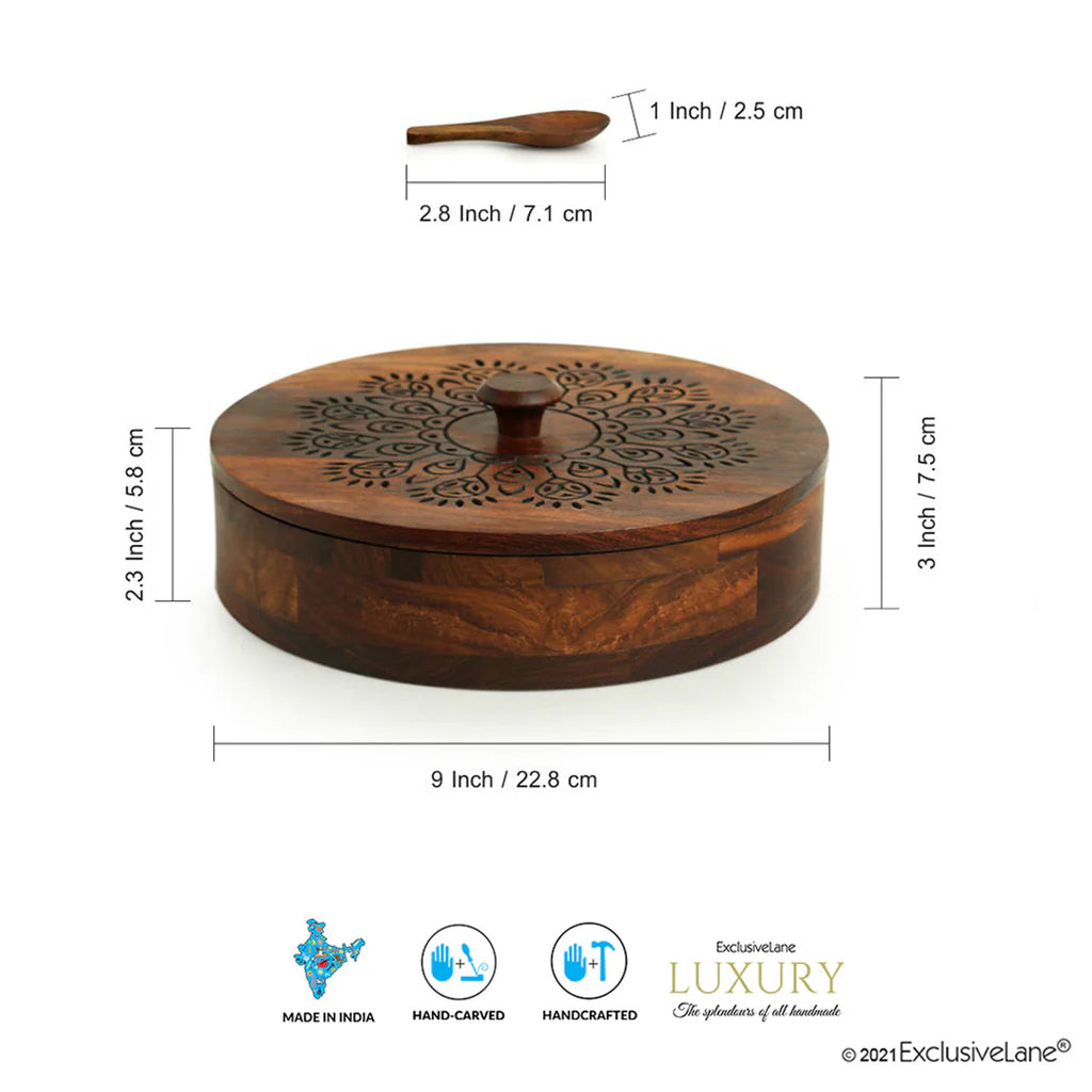 ''Dancing Peacock' Hand Carved Spice Box With Spoon in Sheesham Wood