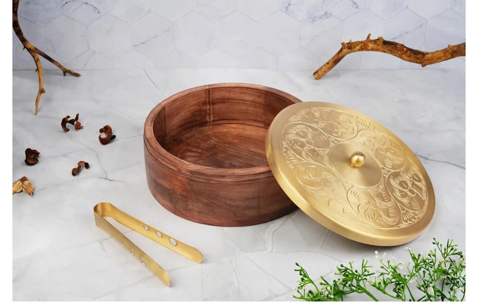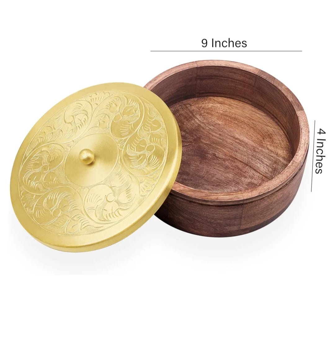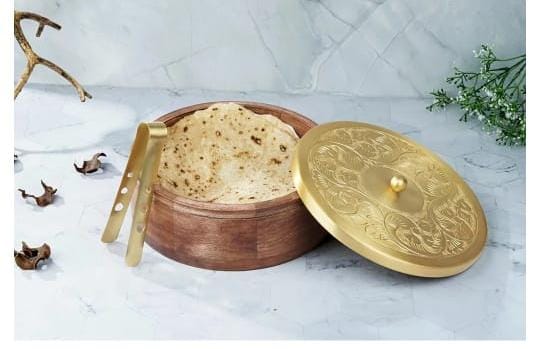 Gold Plated Brass Lid With Wooden Base Roti Box
