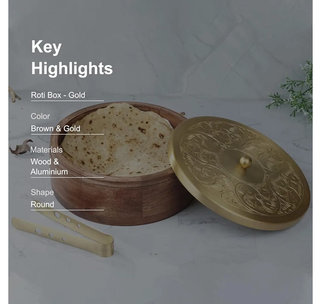 Spice up your kitchen with this Roti Box featuring a gold plated brass lid and wooden base. Whether you're storing rotis, flatbreads, or other treats, this box adds a touch of elegance and charm. Keep your food fresh and your style on point with this unique piece.