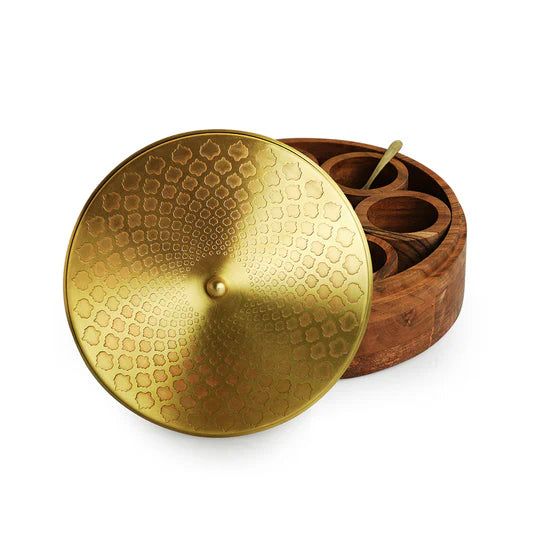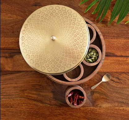 Hand-Etched Spice Box With Spoon In Brass & Acacia Wood "The Nabilla"
