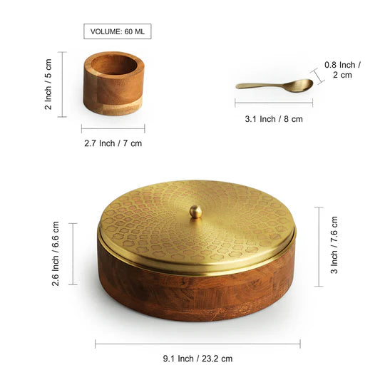 Indulge in the ultimate culinary experience with our Hand-Etched Spice Box and Spoon. Crafted from luxurious brass and acacia wood, each piece is hand-etched for a truly unique and exclusive touch. Elevate your spices with this elegant set that adds sophistication to any kitchen.