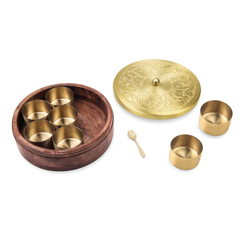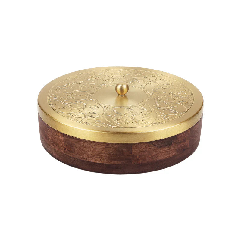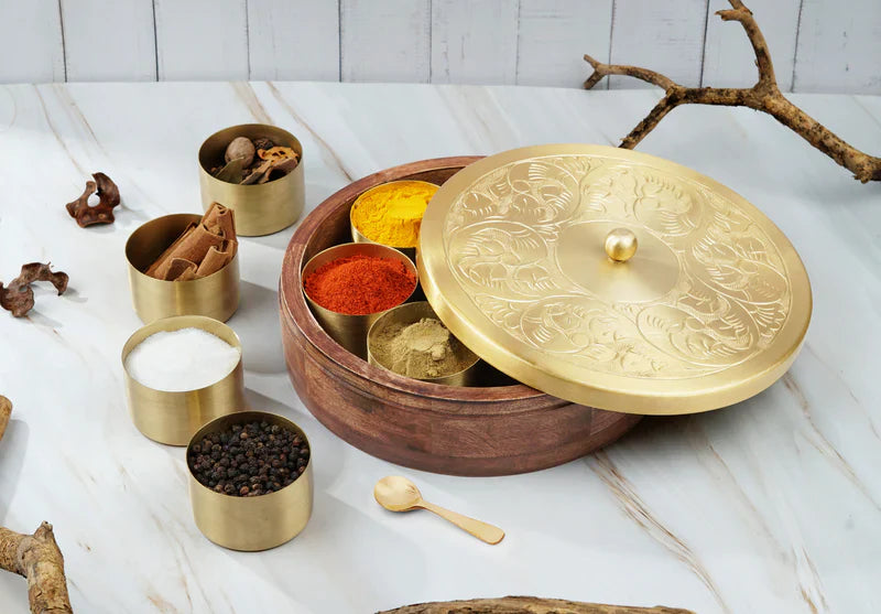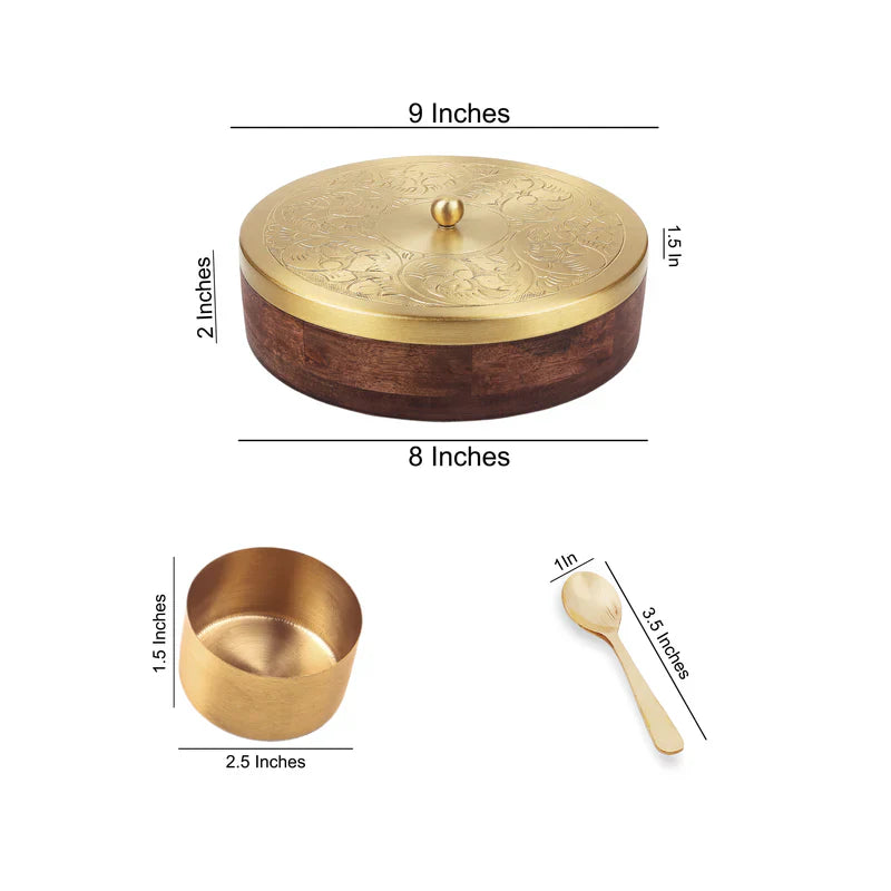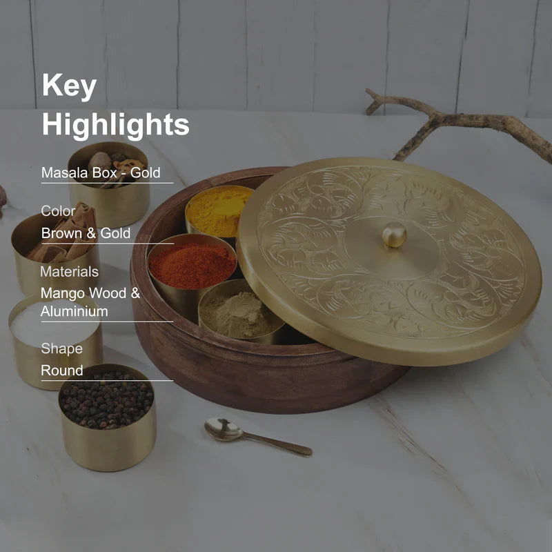 Hand-Etched Wooden Masala Box with Gold Lid