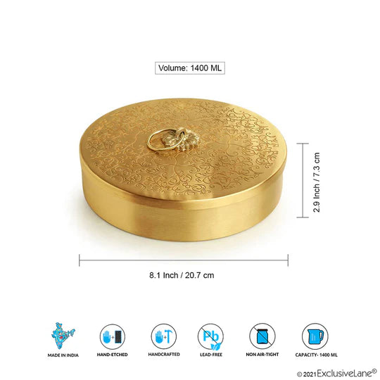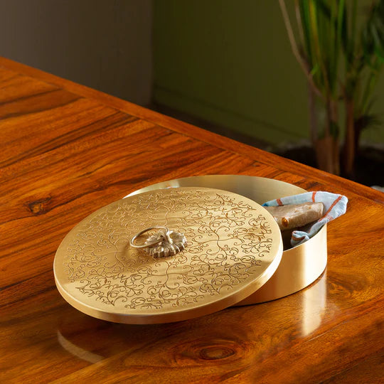 Indulge in the luxurious elegance of our handcrafted chapati box in brass. A true work of art, this box is not only visually stunning but also functional, keeping your chapatis fresh and warm. Elevate your dining experience with this exclusive addition to your kitchen.