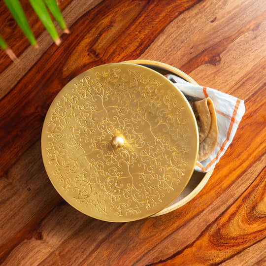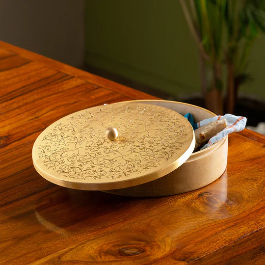 Indulge in the luxurious handcrafted Chapati Box in Brass & Mango Wood. This exquisite piece exudes sophistication and exclusivity, adding a touch of elegance to your dining experience. Made with carefully chosen materials, this box is not only beautiful but also practical, keeping your chapatis fresh and warm.