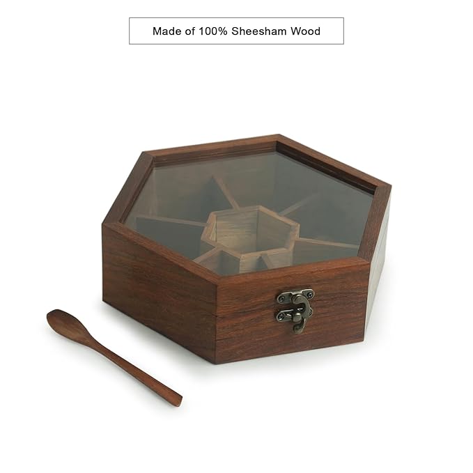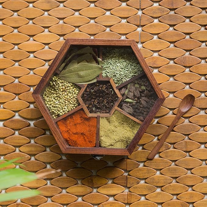 Add a dash of quirk to your kitchen with our 'Hexagonal' Wooden Spice Box! Crafted by skilled Indian artisans, this box comes with a handy spoon for easy seasoning and storage. Elevate your cooking game with this playful addition!