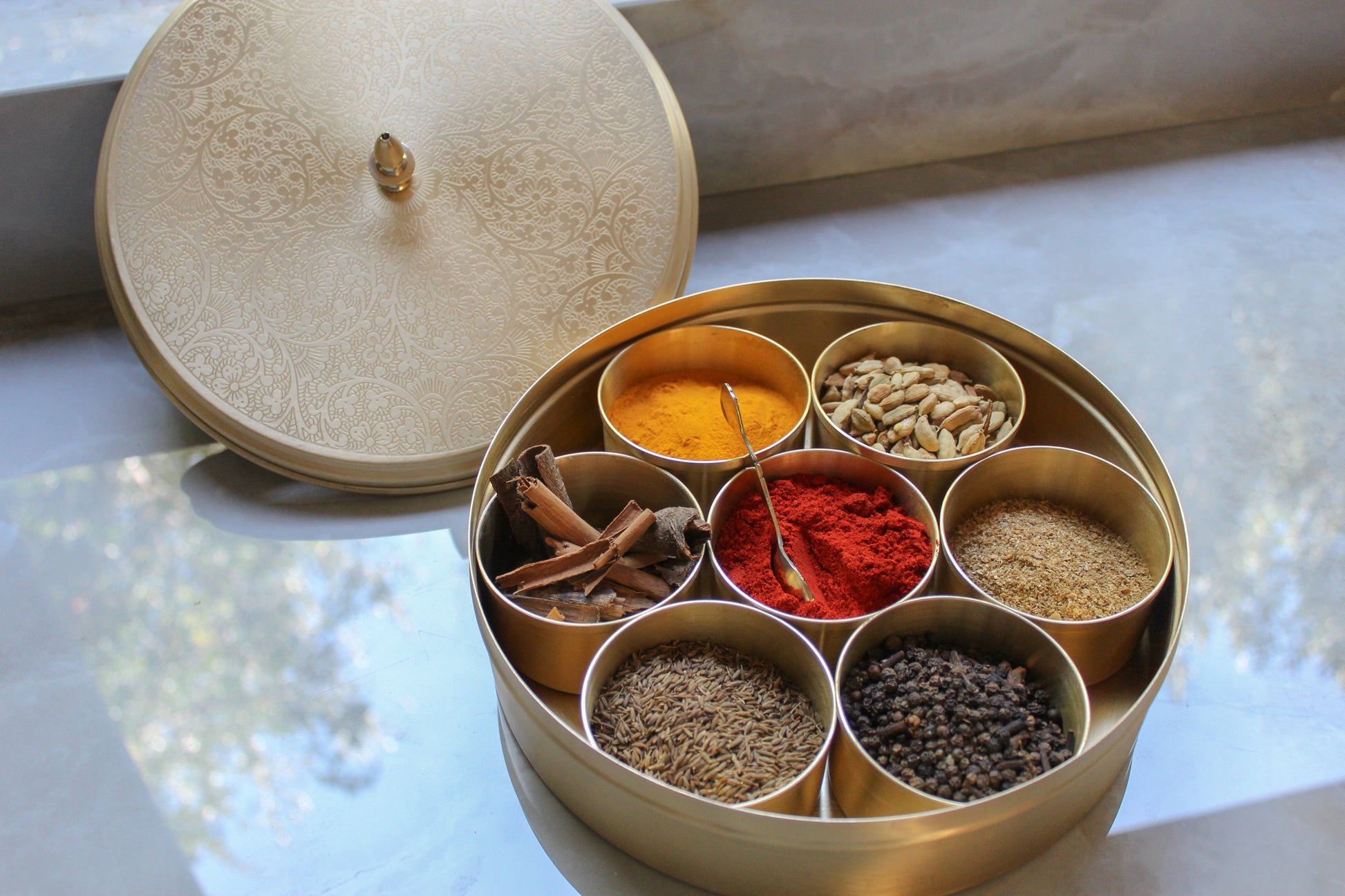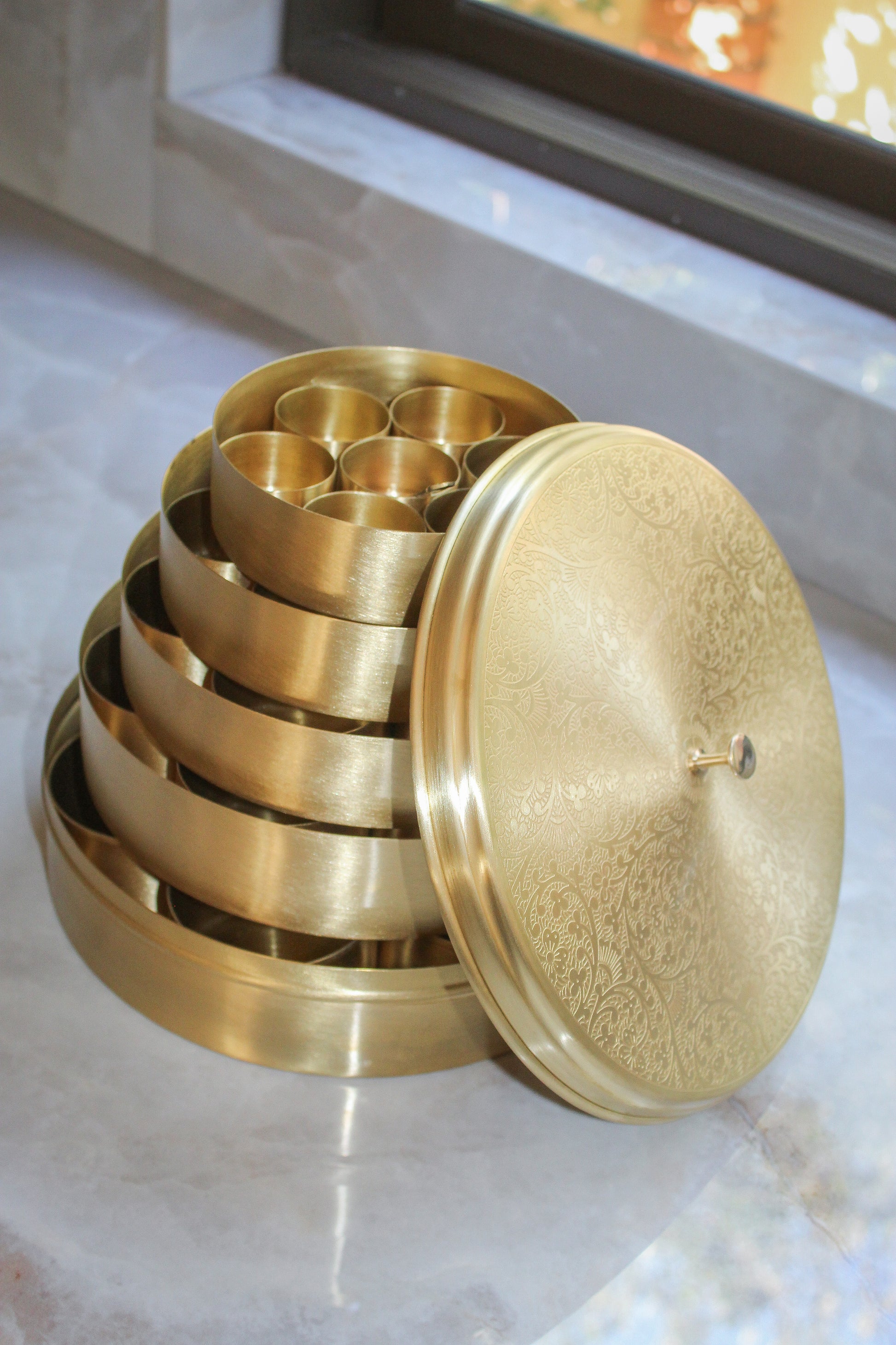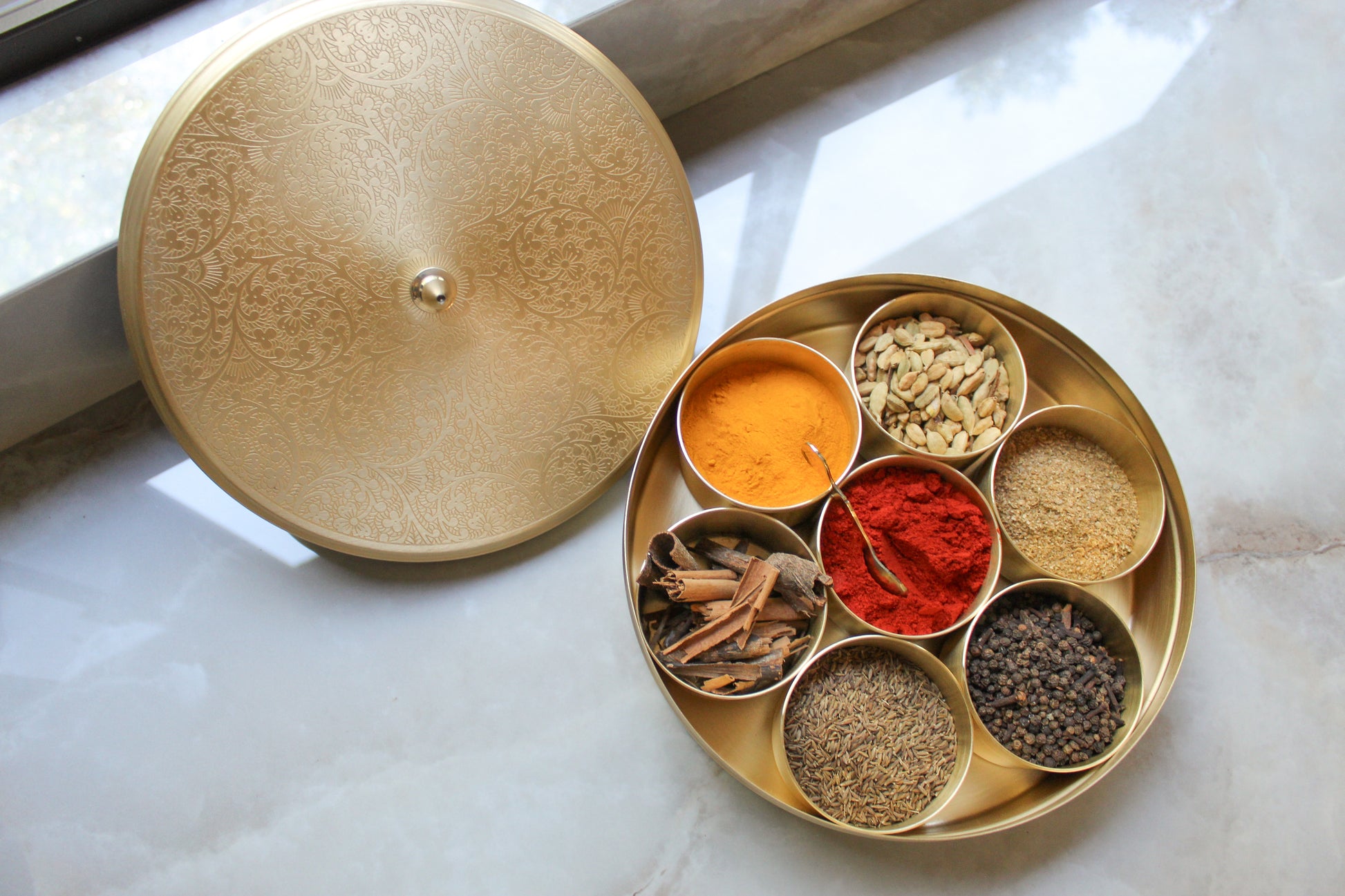 Experience the rich flavors of Indian cuisine with our Shashi Hand Crafted Brass Masala Box. Each masala is hand-crafted to perfection, bringing out the vibrant tastes and aromas. Take your cooking to the next level with this beautiful and functional kitchen essential.